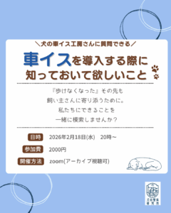 【オンラインセミナー】2026年2月18日(水) 犬の車イス工房さんに質問できる!~車イスを導入する際に知っておいてほしいこと~